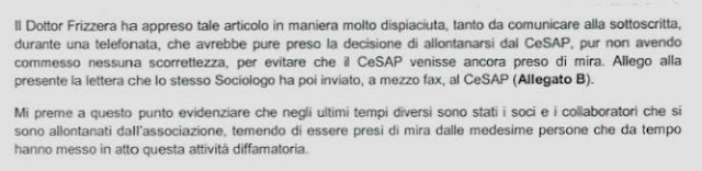 Il Dottor Frizzera ha appreso tale articolo in maniera molto dispiaciuta, tanto da comunicare alla sottoscritta, durante una telefonata, che avrebbe pure preso la decisione di allontanarsi dal CeSAP, pur non avendo commesso nessuna scorrettezza, per evitare che il CeSAP venisse ancora preso di mira. Allego alla presente la lettera che lo stesso Sociologo ha poi inviato, a mezzo fax, al CeSAP.
